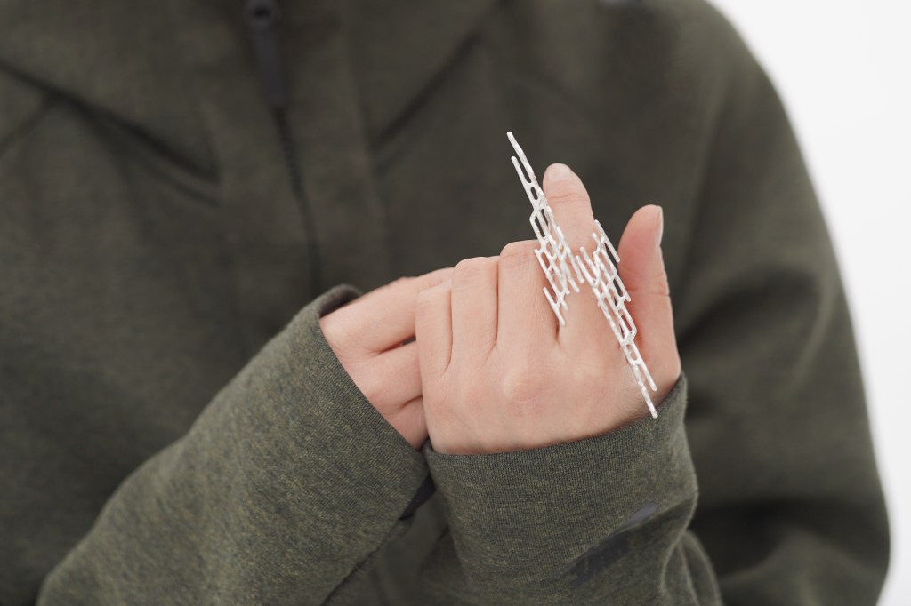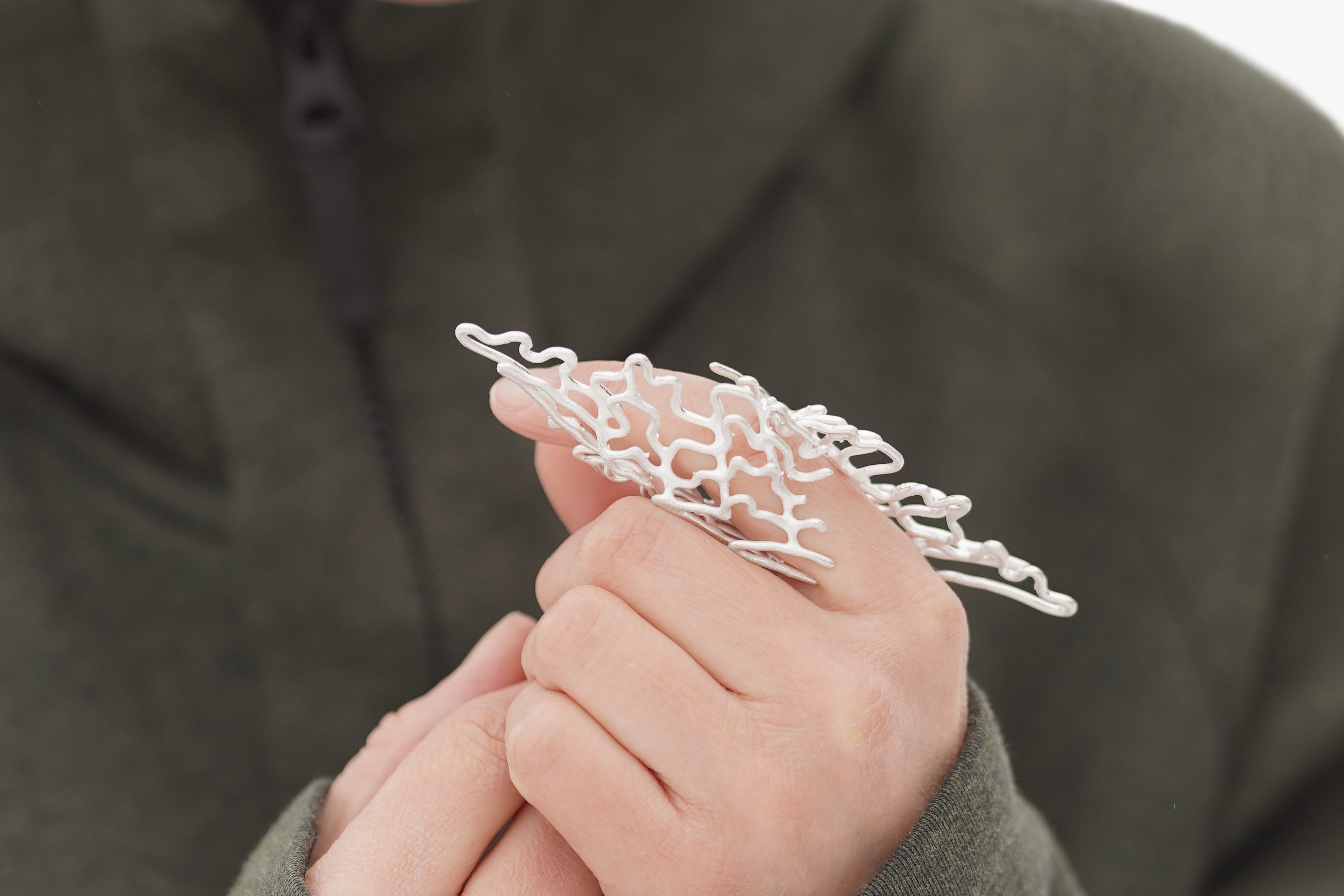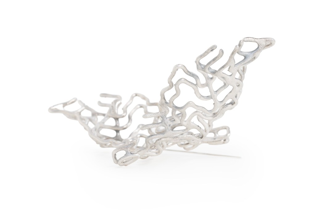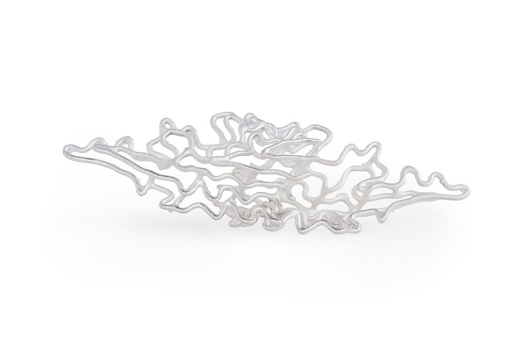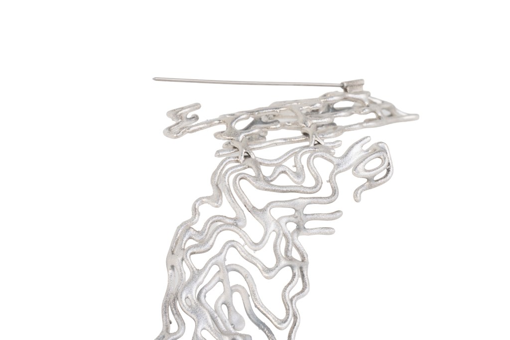 My practice investigates the tension between digital modeling and material transformation, where data-based structures become embodied in metal as new matter. In my work, the digital and the computational are part of a broader material process. The form is created in a digital environment, using a geographical map as the basis for measurement and structure. The piece comes into being through my direct shaping, finishing, and soldering.
