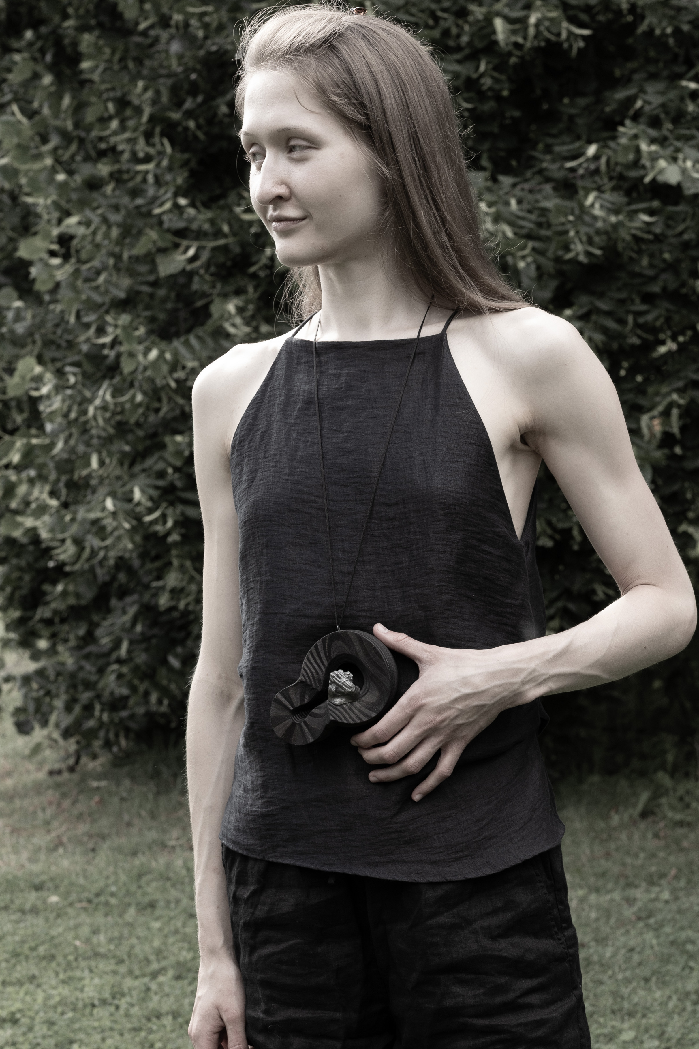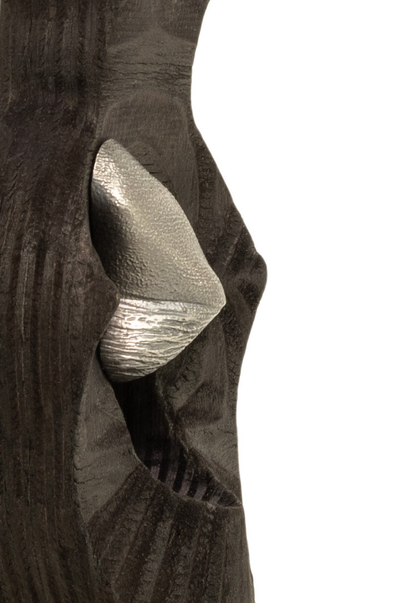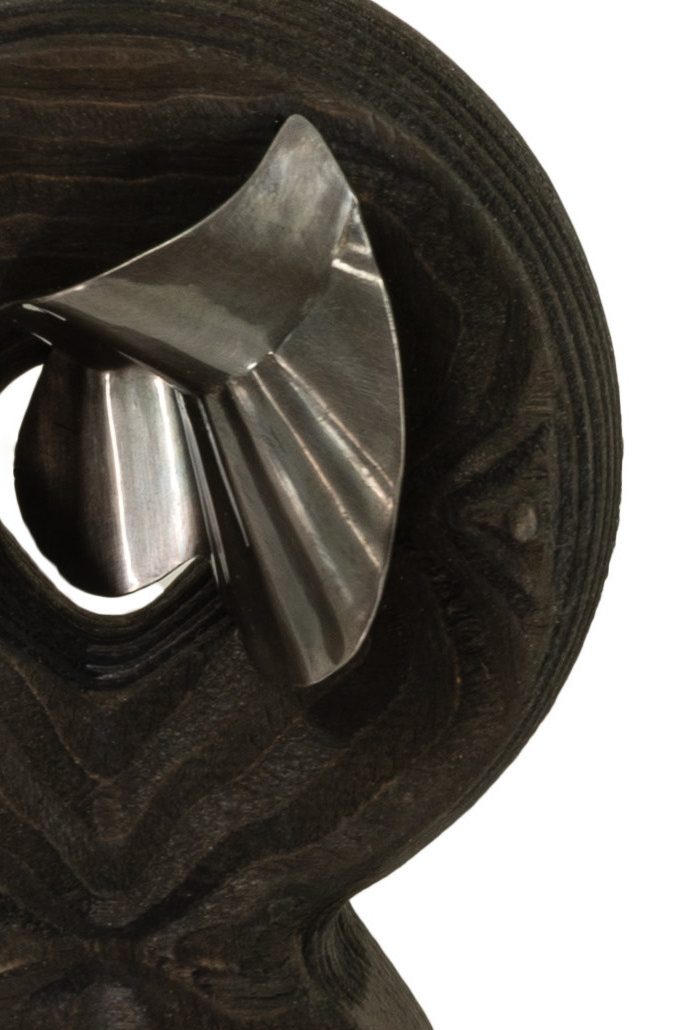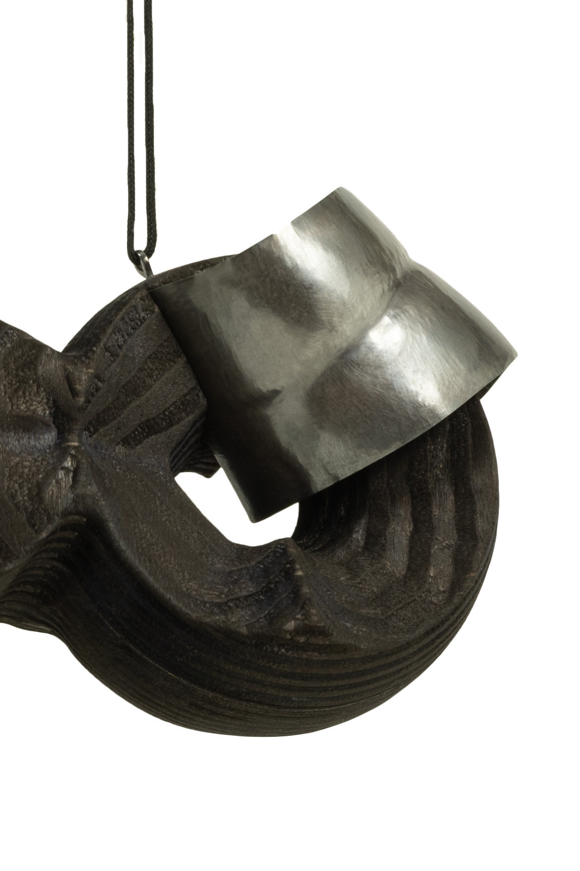 AMPLIFIER, pendants, burned and painted plywood, silver, cord, 2025